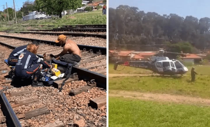Um homem caiu de um trem em movimento, foi atropelado pelo veículo e foi resgatado pelo helicóptero Águia na...