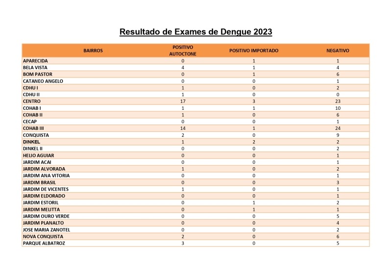 A Diretoria Municipal de Saúde, através da equipe de Controle de Zoonoses atualiza semanalmente os casos da Dengue no Município. Seguindo as medidas orientadas pelo protocolo da vigilância estadual, a equipe da vigilância epidemiológica municipal vem realizando visitas aos imóveis, nebulizações (quando necessária no bloqueio em casos positivos), atividades educativas nas escolas, residências e outros locais, controle de criadouros, avaliações de densidade larvária e notificações.