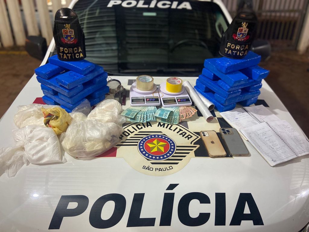 Em seguida, informaram que em sua residência havia mais drogas. Ao chegar ao local, foram encontrados 20 tabletes de maconha, porções de cocaína e diversos apetrechos para fracionamento e embalo da droga, além de balanças de precisão.