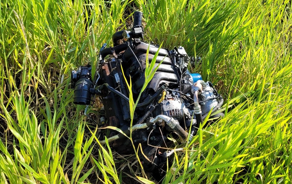 Com o impacto da batida, a frente do carro ficou totalmente destruída e o motor foi localizado a cerca de 20 metros do local do acidente.