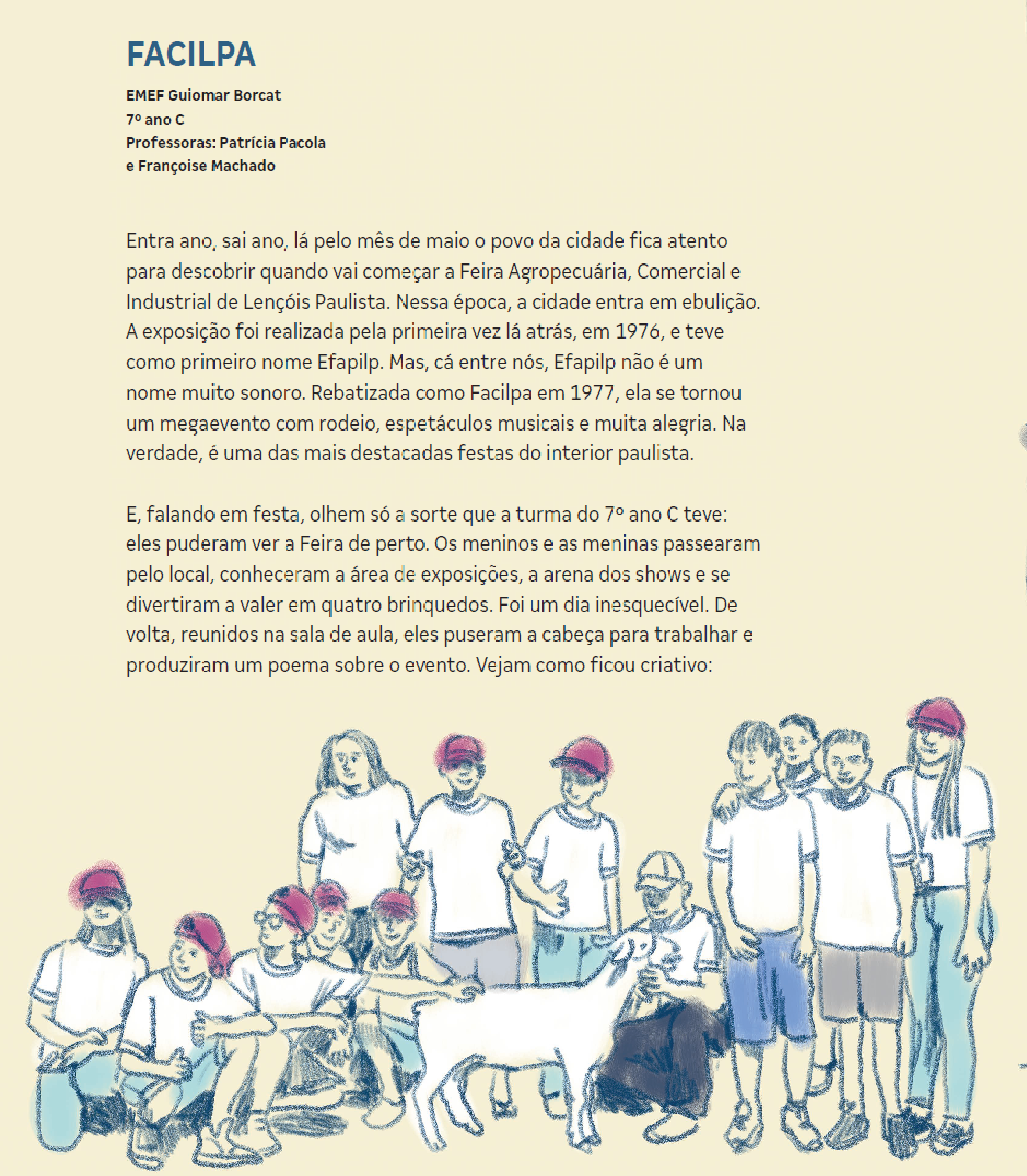 Era uma vez, uma cidade chamada Lençóis Paulista. Um dia, os alunos que lá moravam perceberam o quanto a história daquele lugar fazia parte de suas próprias vidas. Resolveram, então, escrever sobre o rio Lençóis, a Facilpa, as ruas com nomes de escritores e outros patrimônios do município, reunindo tudo no livro “Lençóis Paulista – A cidade da gente”. A obra, com 80 páginas, ficou pronta e será lançada nesta quinta-feira, dia 9, no Teatro Municipal Adélia Lorenzetti, com direito à noite de autógrafos dos próprios estudantes às 19h.