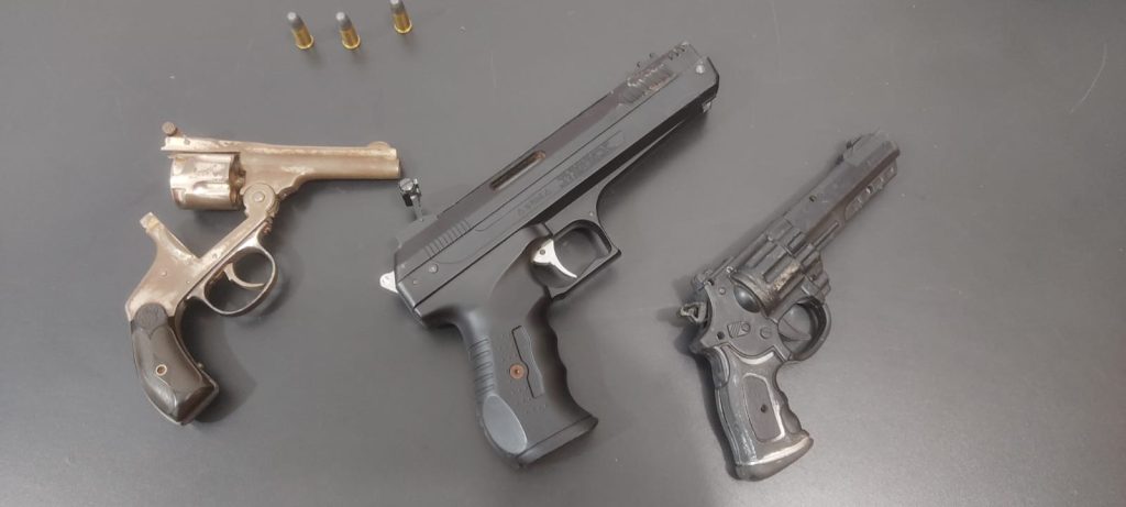 Ao retornarem ao local onde foi arremessado algo pela janela, localizaram um revolver cal. 32, carregado com três munições. Novamente questionados, o menor assumiu a propriedade do armamento.