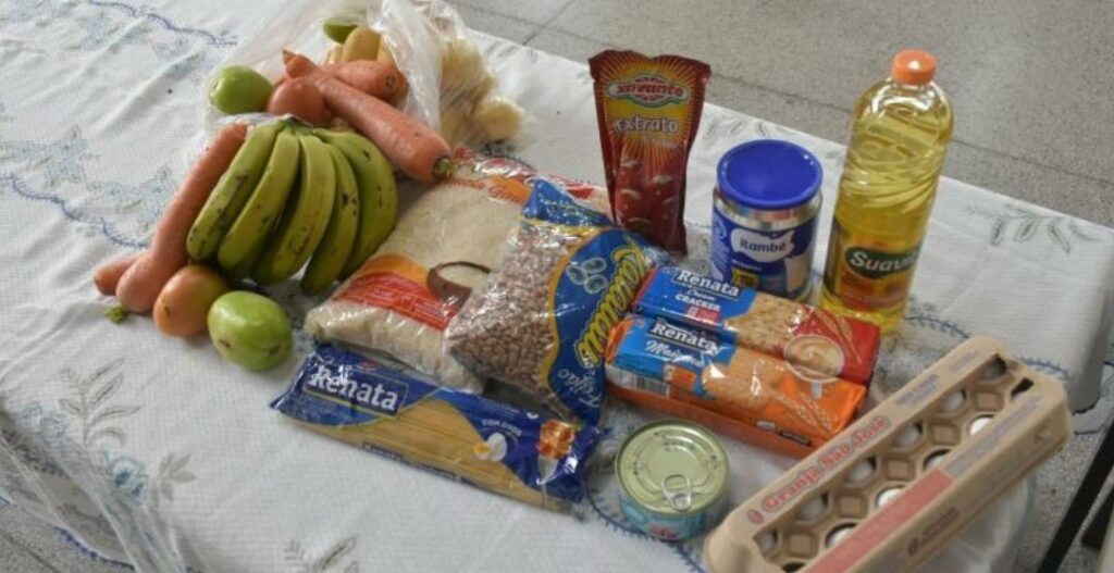– Kit seco: 2kg de arroz, 1kg de feijão, 1 pacote de macarrão, 1 extrato de tomate, 1 lata de atum, 1 lata de leite em pó, 1 pacote de bolacha salgada, 1 pacote de bolacha doce e 1 frasco de óleo de girassol.