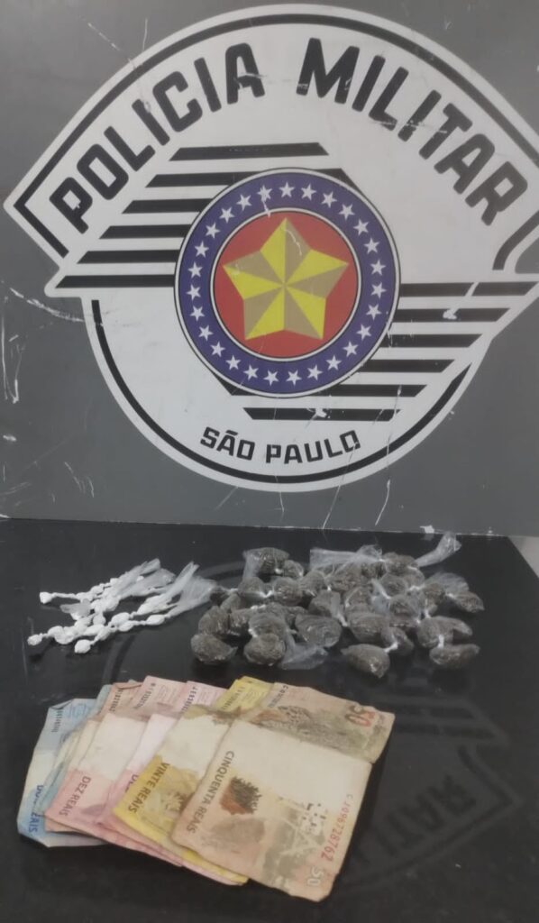 Ao ser realizada a abordagem e a busca pessoal foram encontradas com o criminoso 45 porções de maconha, 30 de cocaína e R$ 148,00 em espécie.