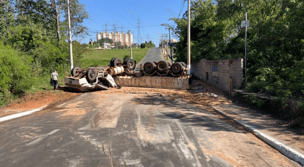 O veículo vinha de Santa Cruz da Conceição (SP) e tombou por volta das 9h, próximo ao local onde faria a entrega da carga.
