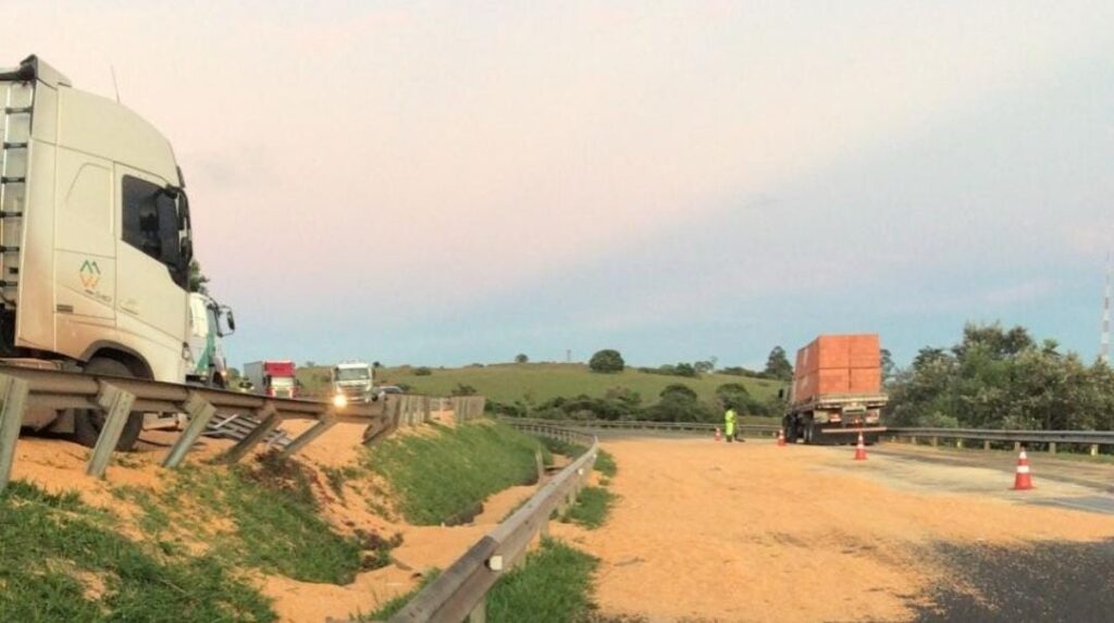 Carreta carregada com milho tomba e interdita trecho da Rondon em Botucatu