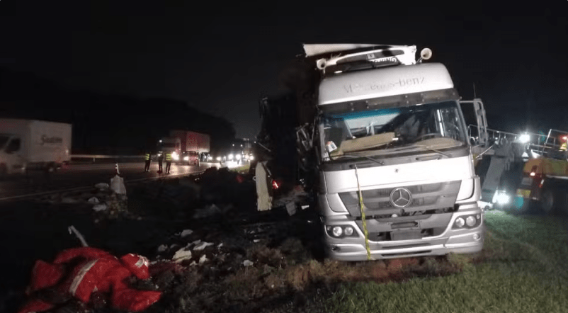 A colisão aconteceu no quilômetro 74+396 da via, sentido norte. De acordo com a Polícia Rodoviária, o caminhão transportava 16 toneladas de legumes, quando colidiu na lateral de um veículo e tombou sobre o automóvel.