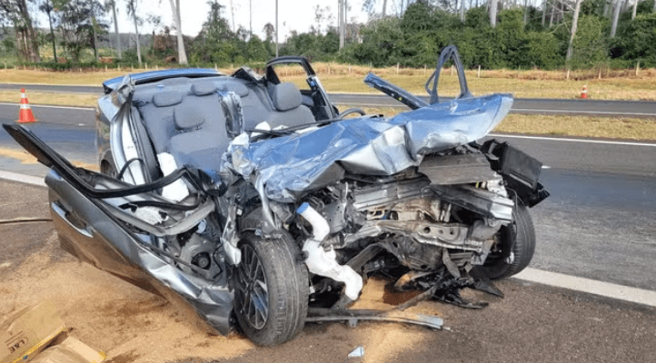 Um carro ficou totalmente destruído após bater na traseira de uma carreta, na tarde desta terça-feira (14), na Rodovia Comandante João Ribeiro de Barros, a SP-225, em Pederneiras (SP). O motorista do veículo disse ter cochilado ao volante.