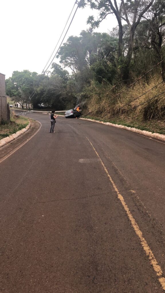 Segundo as informações, o carro bateu em um poste, que caiu. O carro foi parar em uma canaleta, atingindo um barranco. Nesse momento pegou fogo.