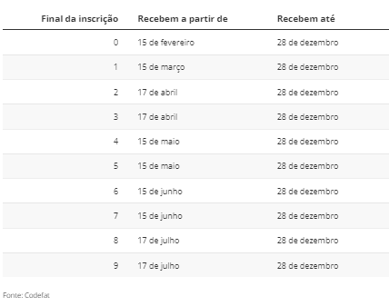 Para o pagamento do PIS é considerado o mês de nascimento do trabalhador. No caso do Pasep, é considerado o dígito final do número de inscrição no programa. Todos os beneficiários podem sacar o dinheiro até o dia 28 de dezembro.
