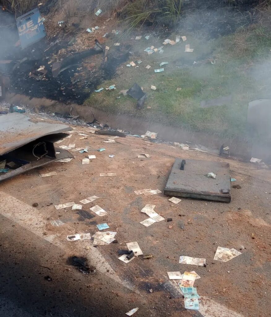 O crime aconteceu na altura do quilômetro 143 da rodovia. Houve troca de tiros, os criminosos explodiram o blindado e o dinheiro ficou espalhado pela estrada no fim da tarde desta segunda-feira (13). Boa parte das notas acabou destruída na explosão.