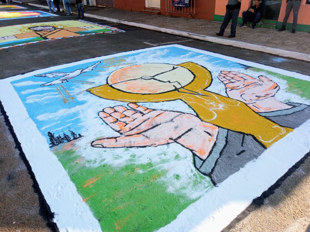 Desde as primeiras horas da madrugada desta quinta-feira (08), as equipes trabalham na confecção de tapetes e passarelas. Neste ano a festa completará 74 anos de tradição, em São Manuel.