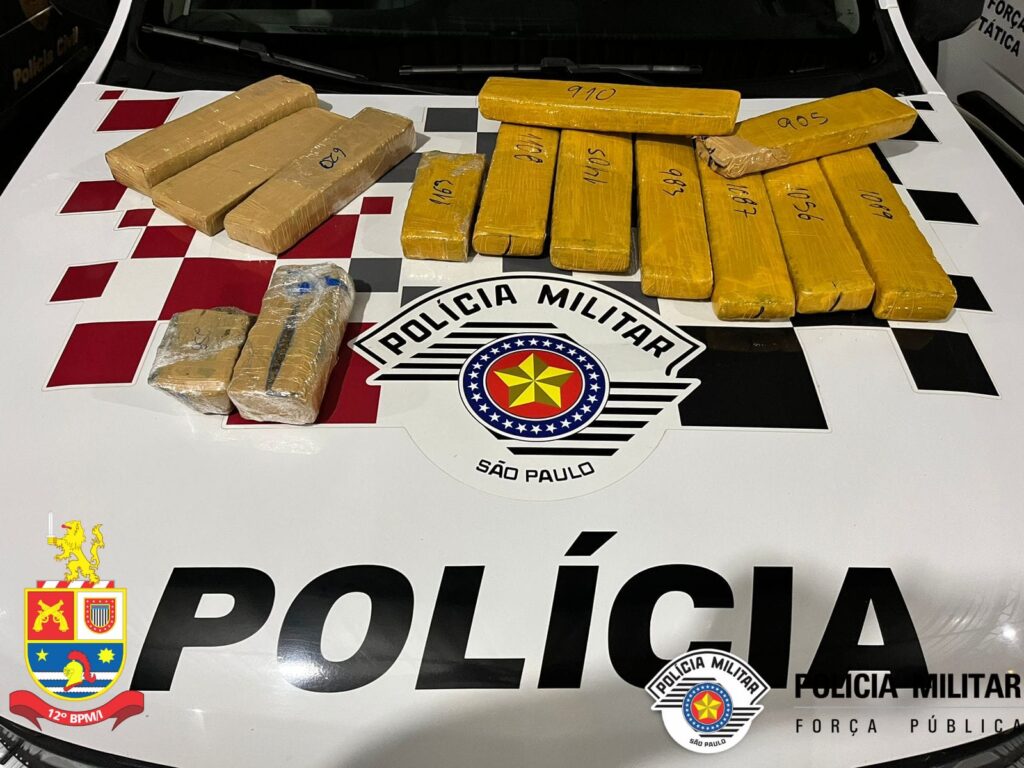 Inicialmente nada de ilícito foi encontrado, porém ao ser realizada busca veicular, foi localizado um tablete de maconha de 260 gramas no porta malas do veículo, no meio de algumas peças de roupas.