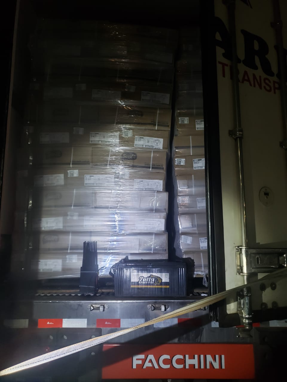 Ao realizar vistoria na carreta, foi localizado no compartimento de carga um equipamento próprio para bloquear sinal de rastreador.