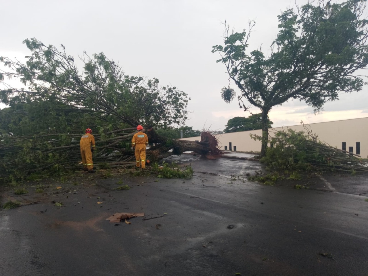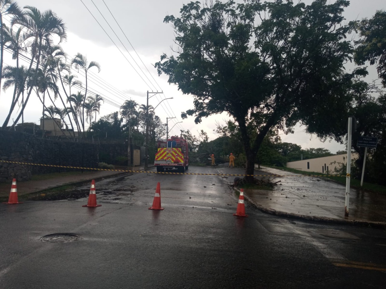 Os bombeiros trabalharam para a retirada do enorme tronco e galhos. Botucatu possui diversas árvores antigas em risco de queda, como frequentemente ocorre, especialmente na área central.