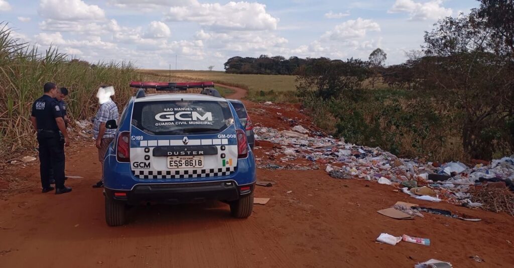 Durante patrulhamento preventivo nas proximidades do Tiro de Guerra, a Guarda Civil Municipal de São Manuel encontrou um veículo parado com o porta-malas aberto e um homem descartando objetos em local irregular.