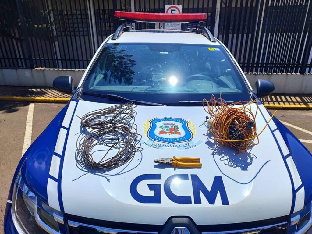 De imediato a equipe composta pelo Sub Cmt Leandro e Gcm Andrigo se deslocaram até o local logrando êxito em deter um indivíduo e localizar aproximadamente 120 mts de cabo de rede elétrica o qual o mesmo já havia subtraído.
