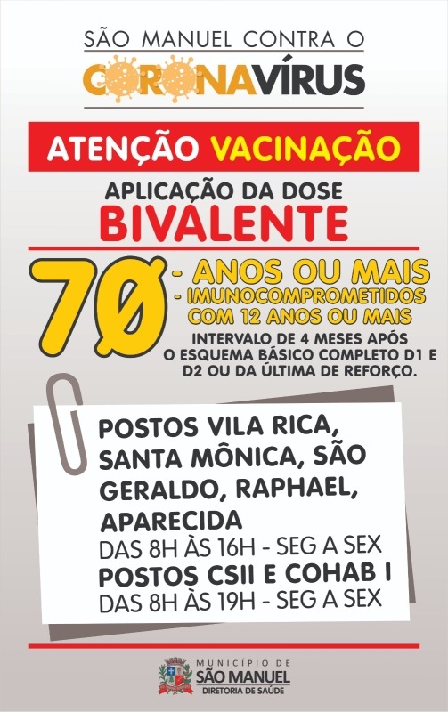 Começa hoje, 27, mais uma etapa da campanha de vacinação contra a Covid-19 em São Manuel. Nesta nova fase, as pessoas serão vacinadas com o reforço do imunizante bivalente da Pfizer.