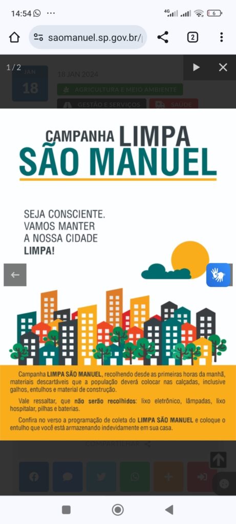 No período de 22 a 26 de janeiro, em ação conjunta, as Diretorias de Agricultura e Meio Ambiente, Gestão e Serviços e Saúde estarão realizando a campanha “Limpa São Manuel”, recolhendo materiais descartáveis que a população deverá colocar nas calçadas, inclusive galhos e entulhos.