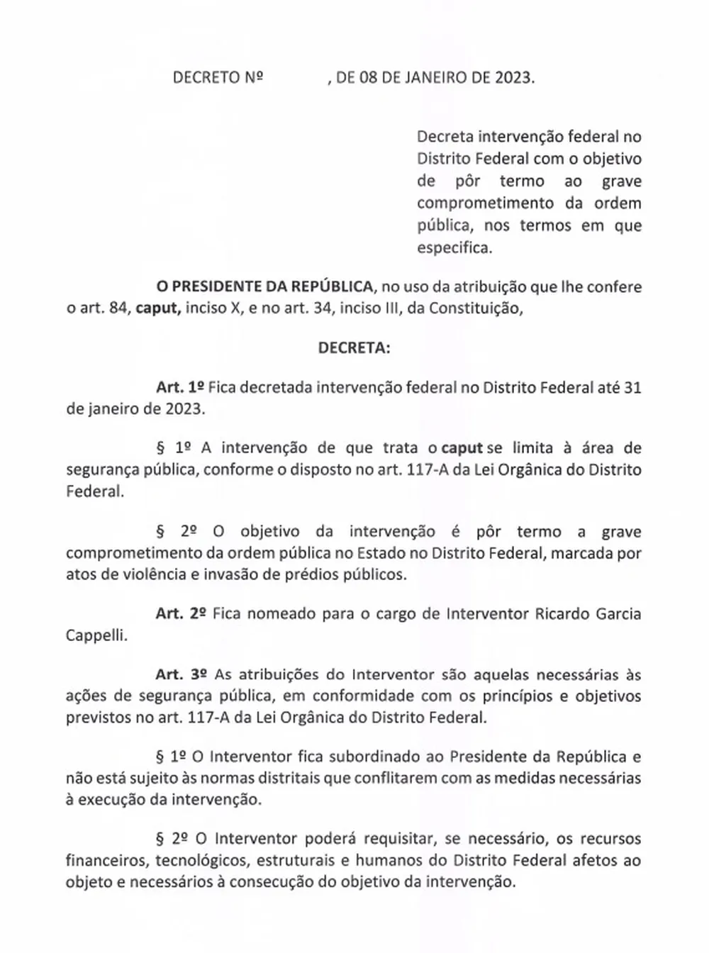 Veja íntegra do decreto de intervenção federal assinado por Lula: