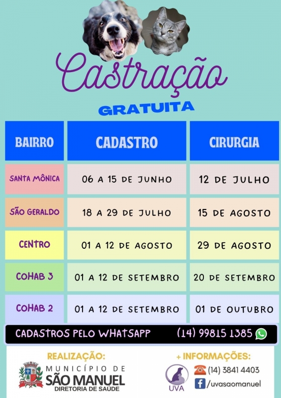 Confira na imagem o bairro, período de cadastro e data de cirurgia que as castrações irão ocorrer.