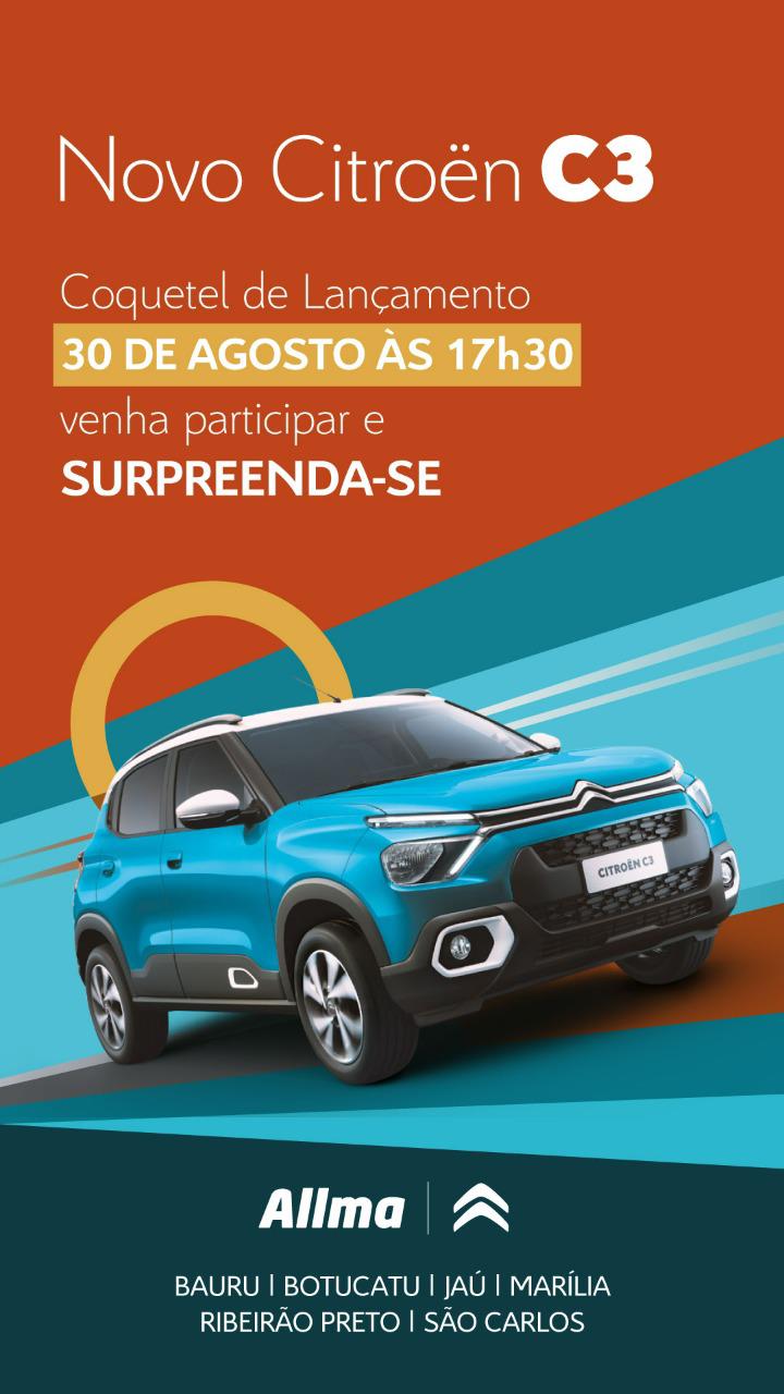Na próxima terça-feira (30/08) às 17h30, a Allma Citroën realiza o coquetel de lançamento do novo C3. O veículo mais aguardado do ano, será apresentado nacionalmente na live da marca e um exemplar estará disponível na concessionária de Botucatu.