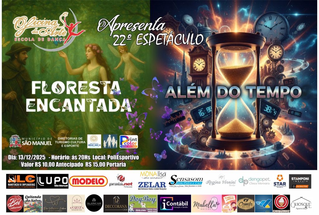 A Escola de Dança Oficina da Arte realiza no próximo dia 13 de dezembro de 2025, às 20h, no Poliesportivo de São Manuel, o seu 22º espetáculo anual, reunindo duas produções distintas: “Floresta Encantada” e “Além do Tempo”. As coreografias percorrem universos que vão do imaginário fantástico da natureza aos mistérios que envolvem a passagem do tempo. O espetáculo tem direção de Jorge e Laís Petrim, responsáveis pela construção artística e coreográfica da apresentação.