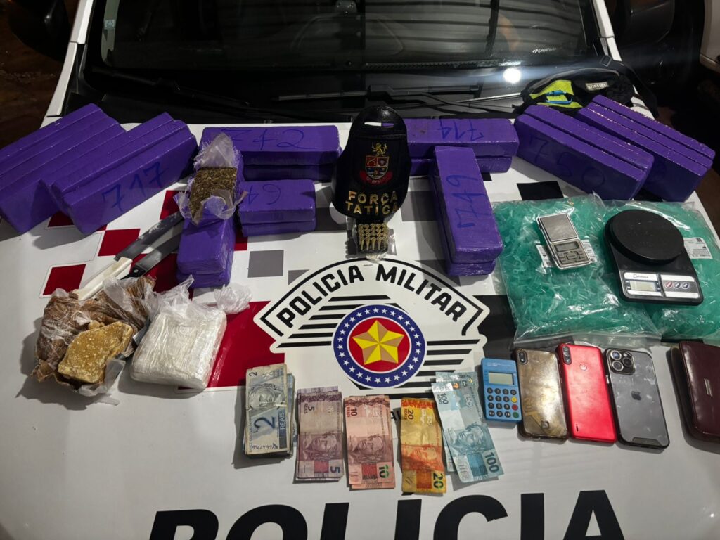 A ação levou à apreensão de 15,9 kg de maconha, 476 g de cocaína, 376 g de crack, 20 munições calibre .38, 2 balanças de precisão, celulares e R$ 410,00 em dinheiro.