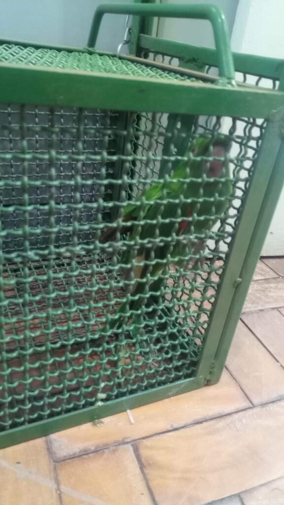 No momento da prisão foi encontrada uma ave da espécie “papagaio” verdadeiro, sem anilha, sem documentação e com as asas cortadas, caracterizando assim crime ambiental.