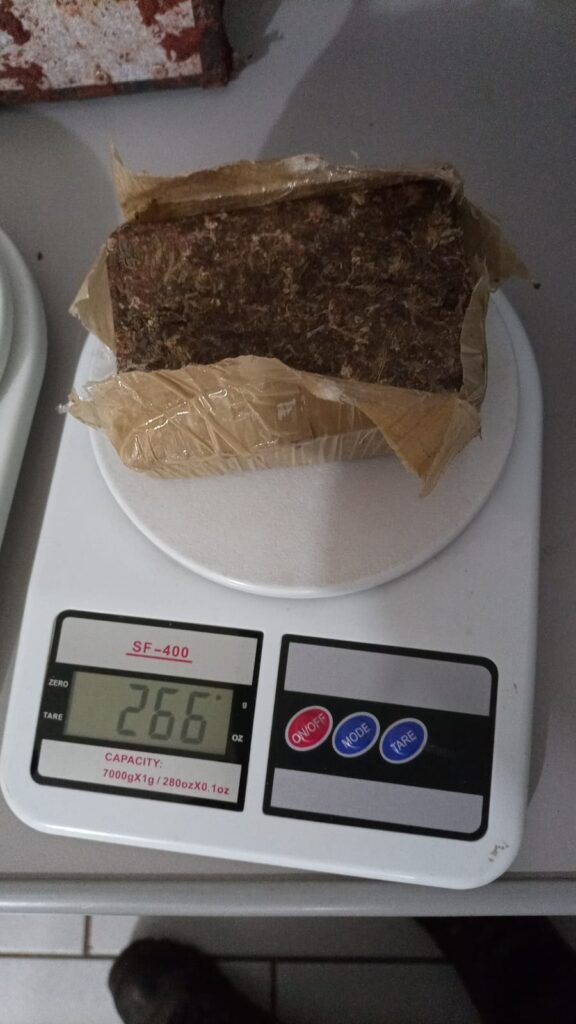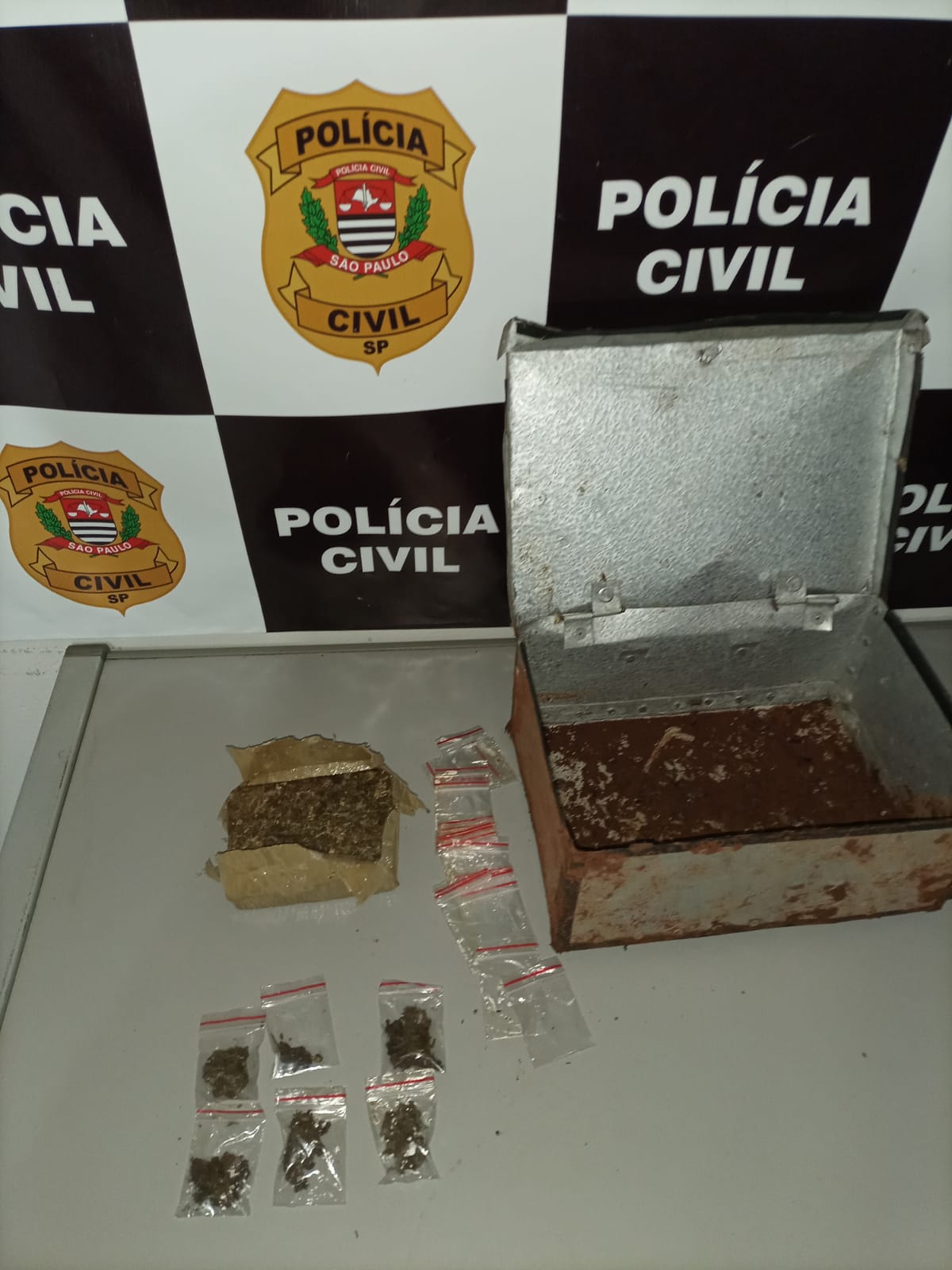 Os policiais chegaram inclusive a flagrar um indivíduo desenterrando uma caixa metálica que após verificação continha em seu interior um tijolo prensado de maconha, pesando 265 gramas, seis porções já embaladas, e inúmeras embalagens idênticas às porções individualizadas.