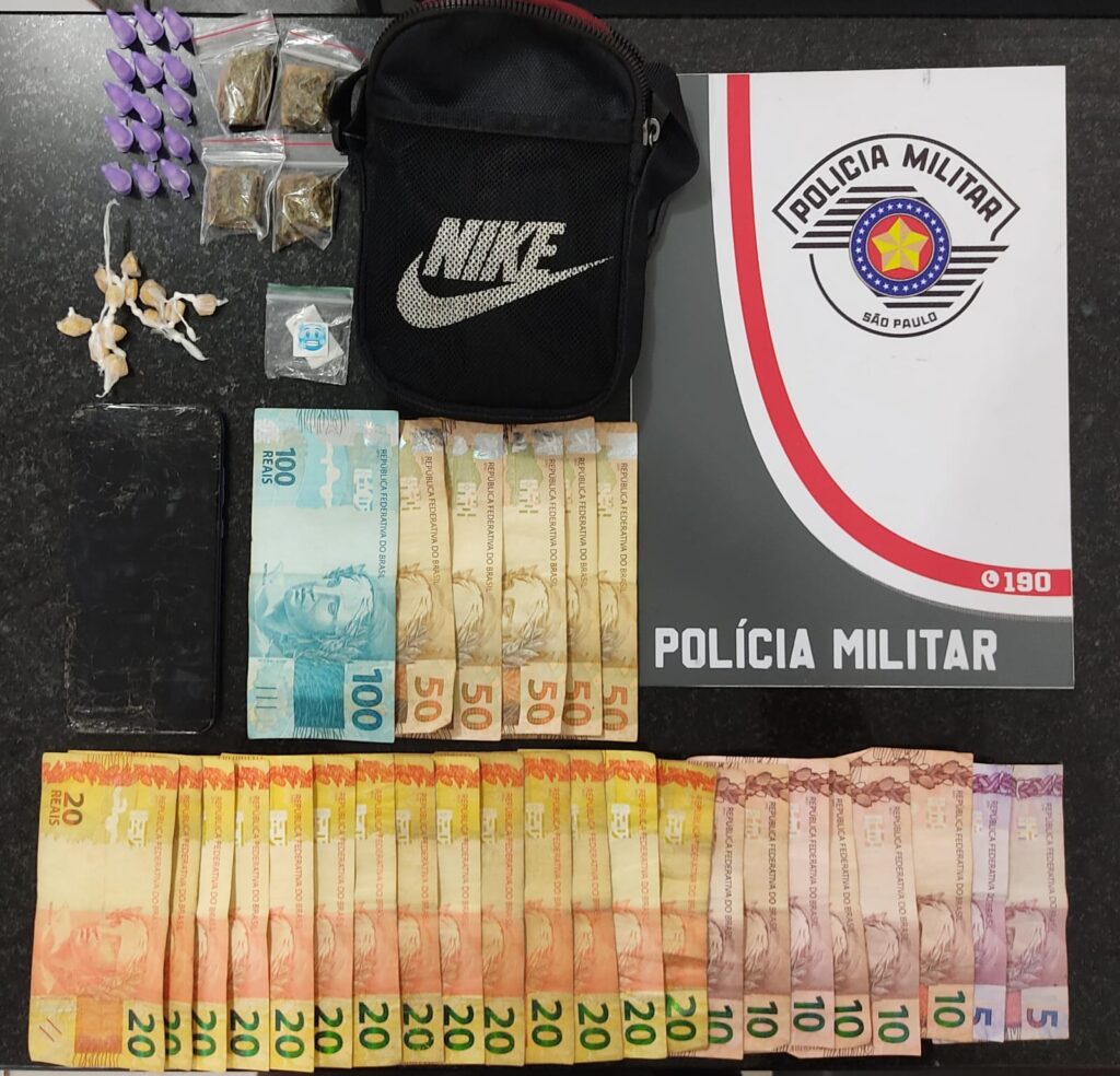 O suspeito foi abordado e ao retornar na residência, localizaram na bolsa 15 porções de cocaína, 4 de maconha, 12 de crack e 1 de dray, além de dois aparelhos celulares e R$ 700,00 em dinheiro.