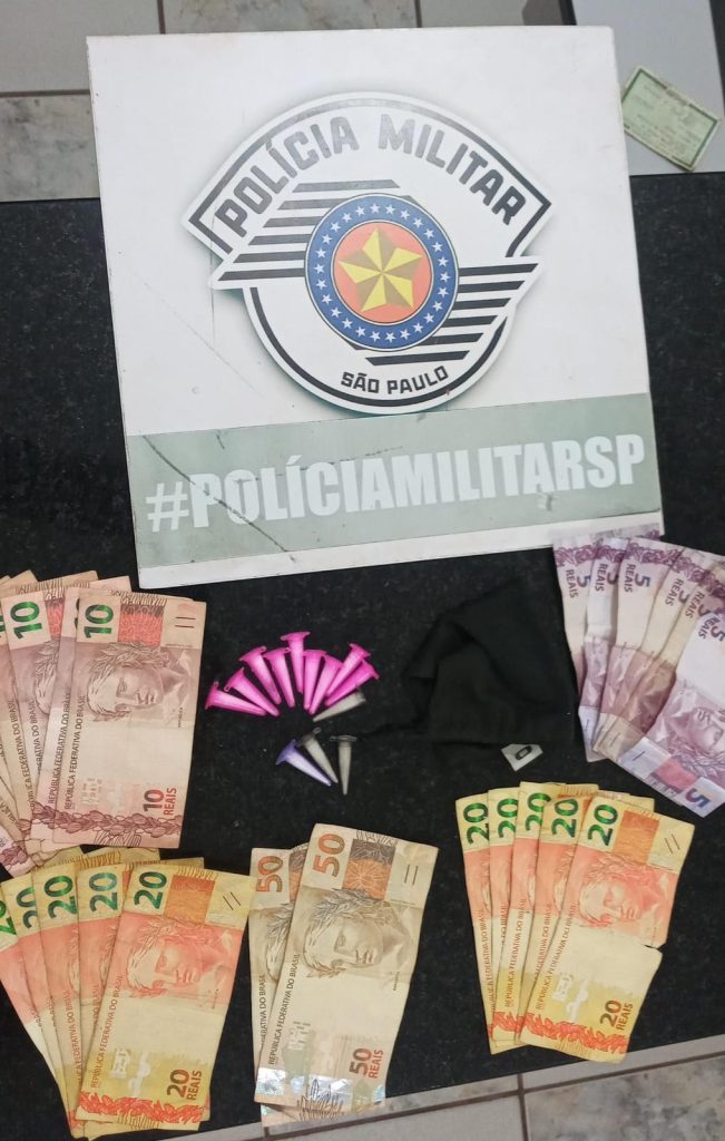 Ao realizar a abordagem e busca pessoal onde foi localizado 13 eppendorfs de cocaína e a quantia de R$ 410,00.