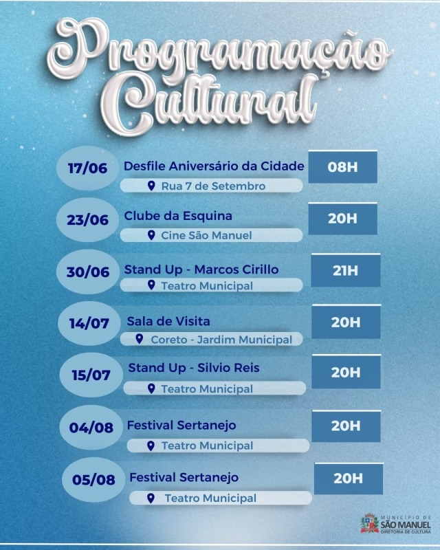 As programações se encerram nos dias 04 e 05 de agosto, às 20h, com um Festival Sertanejo no Teatro Municipal.