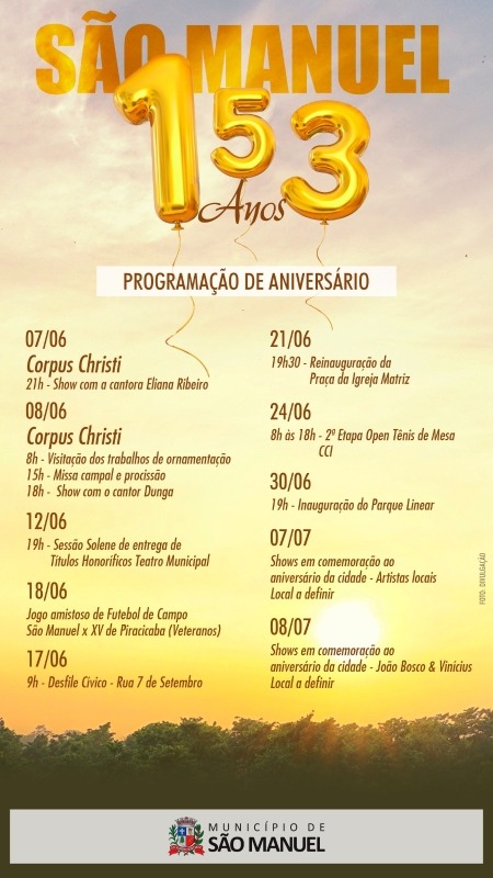 Neste sábado, 17, São Manuel completará 153 anos, e em comemoração a Prefeitura Municipal preparou uma programação especial que terá início com o desfile cívico na Rua 7 de Setembro à partir das 09h.