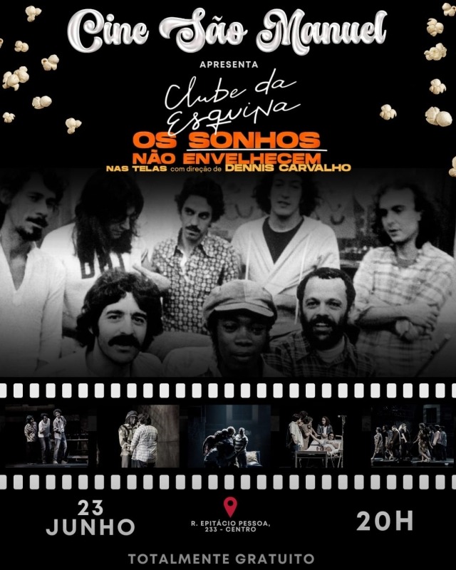 No dia 23 será exibido o musical “Clube da Esquina”, gratuitamente no Cine Teatro de São Manuel, às 20h. A obra é inspirada no livro de Márcio Borges e direção de Denis Carvalho, contando a história de jovens músicos que se reuniram em Belo Horizonte no início dos anos 60 e criaram o grupo Clube da Esquina.