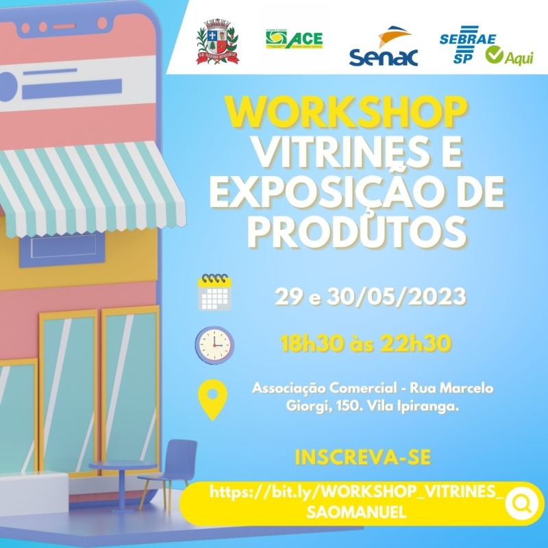 As inscrições deverão ser feitas através do link https://bit.ly/WORKSHOP_VITRINES_SAOMANUEL ou diretamente no SEBRAE, situado na Rua Epitácio Pessoa, 1100, das 08h às 11h30 e das 14h às 16h.