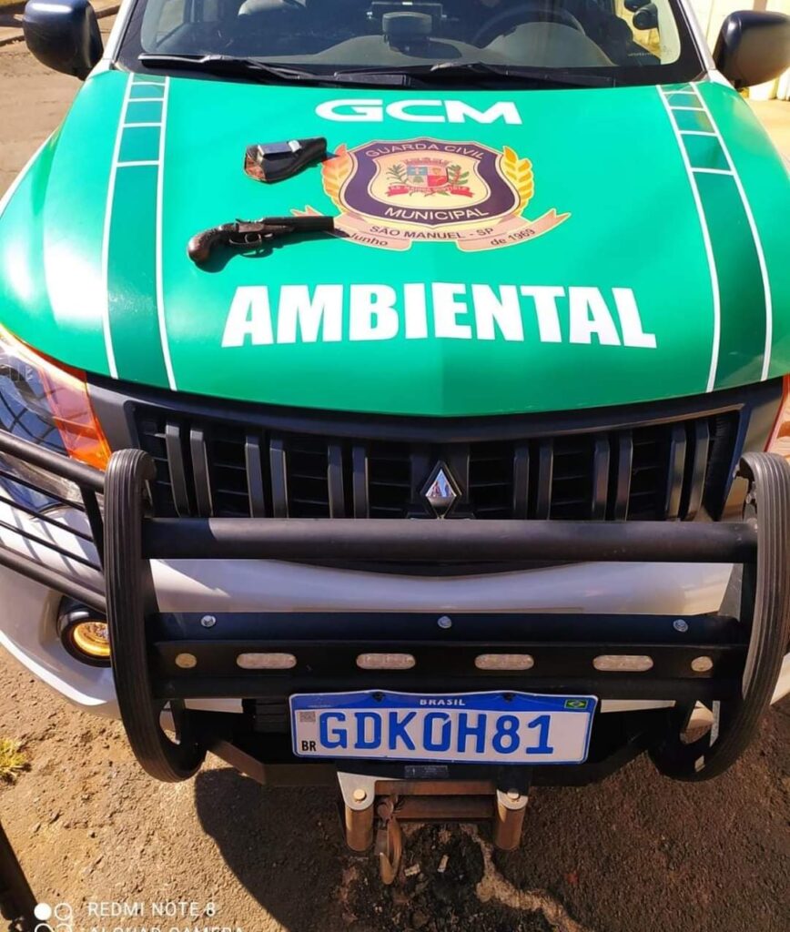 Arma e suspeito foram apresentados no plantão policial, ficando a disposição da justiça pelos crimes de descumprimento de medida protetiva, porte ilegal de arma de fogo e disparo de arma de fogo. (Diretoria Municipal de Segurança e Trânsito de São Manuel)