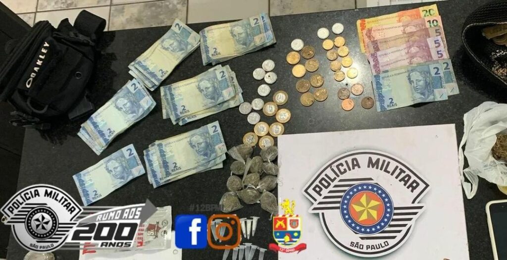 Durante a revista pessoal foi localizada com um menor de idade certa quantidade em dinheiro e com o outro indivíduo duas porções de maconha. Já na pochete dispensada pelos infratores, foram localizadas mais porções de maconha, bem como uma certa quantia em dinheiro, proveniente do tráfico de drogas.