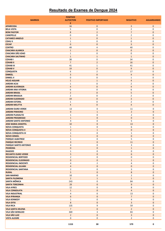 A Diretoria Municipal de Saúde divulgou na tarde desta segunda-feira, 11, através da equipe de Controle de Zoonoses, mais um boletim epidemiológico sobre os casos de Dengue no Município, com um total de 1183 casos positivos de Dengue em 2024.