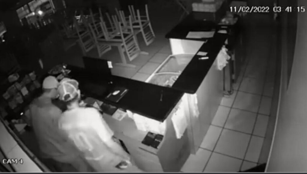 No último estabelecimento a dupla precisou de apenas Um minuto e meio para abrir a porta da lanchonete e roubar o estabelecimento e tomaram rumo ignorado.