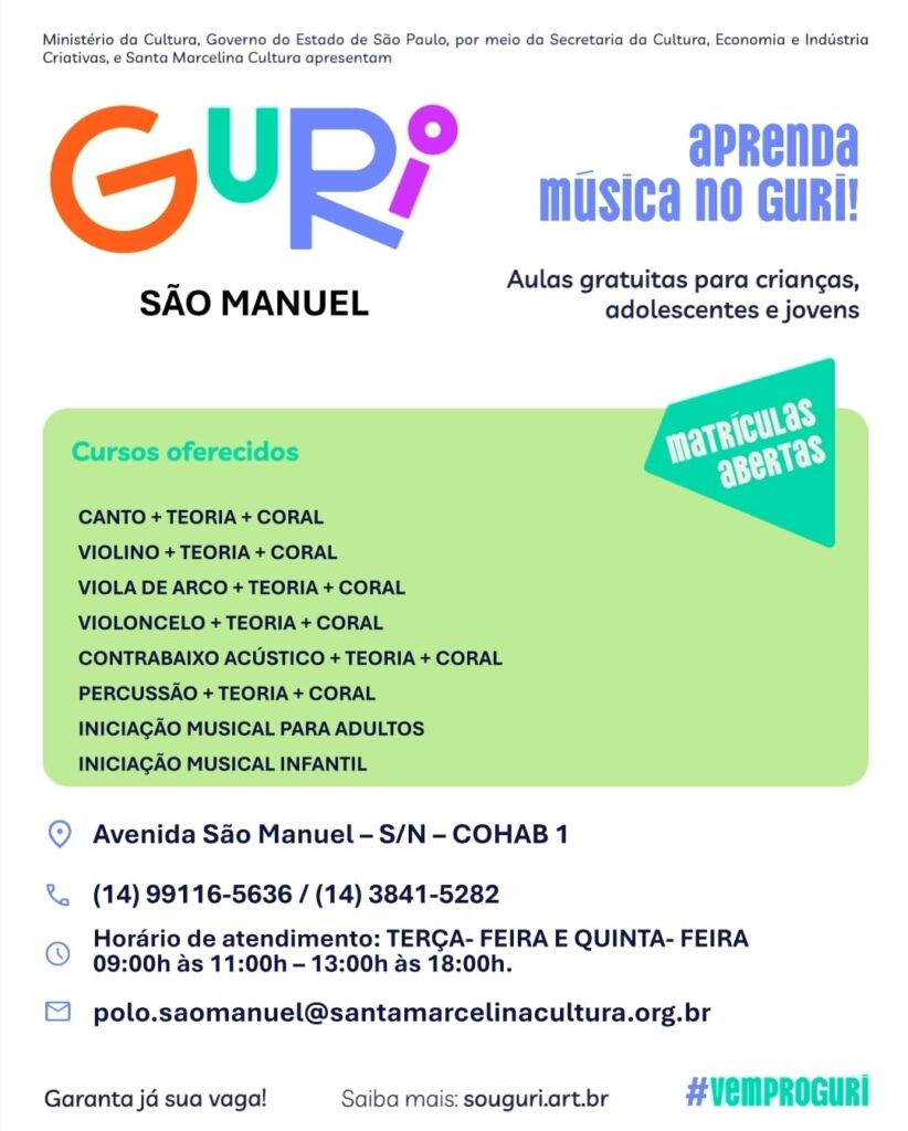 As matrículas para os cursos gratuitos do Projeto Guri – Polo São Manuel começam nesta terça-feira, dia 28 de julho, e prometem movimentar a cena cultural da cidade. Se você é criança, adolescente, jovem ou adulto e sonha em aprender música, essa é a sua chance!