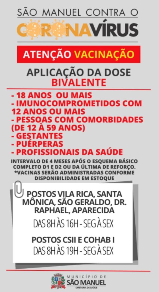 A imunização contra Covid-19 segue sendo feita em São Manuel com a dose Bivalente e a nova fase da imunização abrange a população em geral com mais de 18 anos.