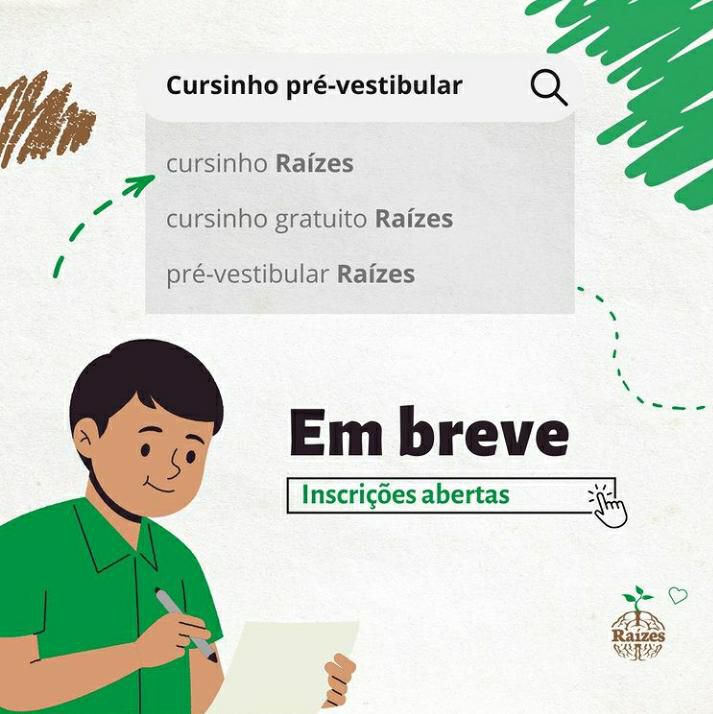 No ano de 2023, o primeiro processo seletivo para a turma extensivo abre dia 6/2 e se encerra dia 15/2, as incrições podem ser feitas pelo link disponibilizado no instragram ou no site do cursinho (www.cursinhoraizes.com.br).